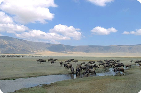 自然保護區位于坦桑尼亞中北部,1979年被聯合國教科文組織宣布為世界自然遺產。保護區的核心是世界聞名的恩戈羅戈羅火山口,有天然動物園及世界第八大奇景的美稱,火山口方圓250 平方公里,600米深,是完整的火山口,也是世界第二大的火山口,型如鑲嵌在東非大裂谷帶上的一只“大盆”。每當春天來臨之際,成千上萬的火烈鳥地聚集在火山口底部的咸水湖上,宛如玫瑰色地薄紗,火烈鳥翩翩起舞,與火山口內生長的各種花卉、植物互相映襯,使恩戈羅戈羅被譽為“非洲伊甸園”。