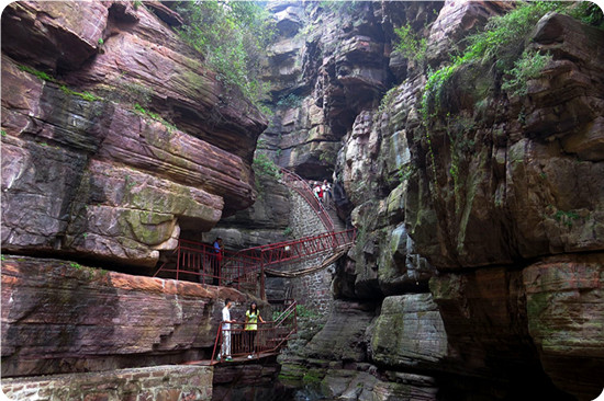大自然的鬼斧神工,把這條峽谷雕鑿得景中有奇,奇中有景,出人意外,神秘莫測。 瀑布龍潭既雄偉壯觀,又揣急驚險,瀑布轟鳴,潭水急旋,峰崖陡峭,谷深路窄。登梯走橋時可從險中觀景,游人追求險中景,甘愿“鋌而走險”身臨險境,領略險中景的妙趣,險中景給游人增添了力量,大有不到真潭非好漢的感受。