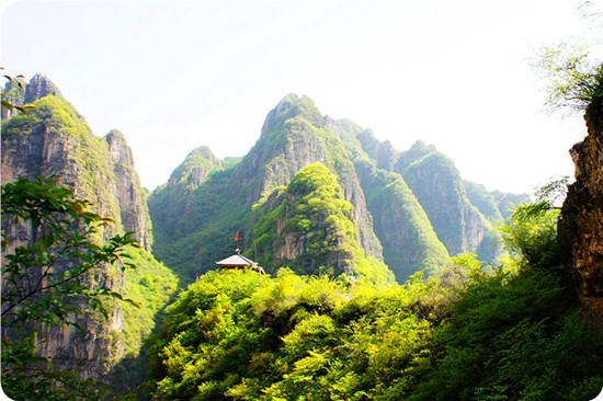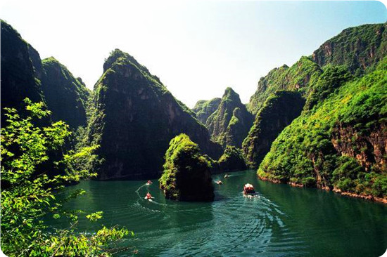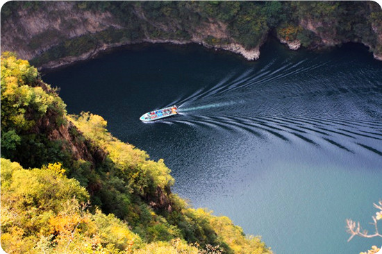 龍慶峽,一直被人們譽為北京的“小漓江”。龍慶峽水庫高聳的大壩相連著兩座山,其寬有四五十米,大壩猶如一把白色的巨鎖把龍鎖住了。登上大壩俯瞰北面,墨綠色的水面倒影著山巒和白云。東西的兩座山,峭壁直立,象刀切似的,足有幾十丈高,“龍慶峽”可能由此峽而得名。那千姿百態的山和石,有的像出鞘的劍,有的像舉起的大錘,有的像昂首的虎,有的像扭著頭的象。因此人們根據它們的形狀取名為“震山如來”、“雞冠子山”、“金缸山”等等。