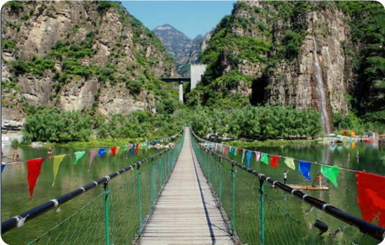 東湖港風(fēng)景區(qū)位于北京房山世界地質(zhì)公園十渡園區(qū)十五渡,與野三坡毗鄰距市區(qū)106公里。景區(qū)內(nèi)翠綠的檀林,蜿蜒的千年古藤遍布整個峽谷,蜿蜒小道曲折而上,潺潺小溪足下流淌,頗具詩意。奇特的“三疊瀑布”落差115米,自女兒泉急流直下,水霧隨風(fēng)飄落,如銀河般掛在峭壁上。有“登云梯而覽群山”之勢。這里以瀑高、潭多而享有盛名,素有“幽谷疊瀑、檀林氧吧”的美譽(yù)。另有夫妻峰、元陽峰、東湖巨佛、石刻畫廊、嫦娥伴金蟬、觀音洞等十余處景觀。東湖港風(fēng)景區(qū)是AAAA級景區(qū)。