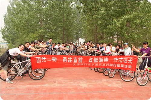 客戶名稱:北京交通銀行東三環支行 活動時間:2013年10月-2批 活動人數:24+23人 活動地點及形式:弗萊宮溫泉山莊,公司內部會議+場地拓展+跑男指壓板與撕名牌 活動項目:延慶媯河國家森林公園—綠色環保騎行 活動描述:由北京交通銀行東三環支行組織,天地之美戶外拓展訓練公司承辦,在北京延慶媯河國家森林公園展開了綠色環保騎行活動。一路騎來,獲得身體上的鍛煉,意志上的磨礪,精神上的超越。 |